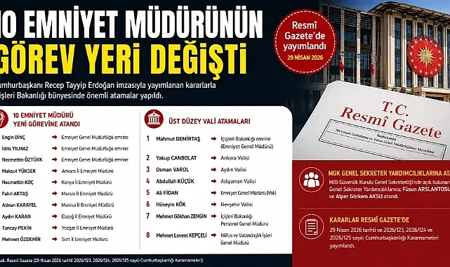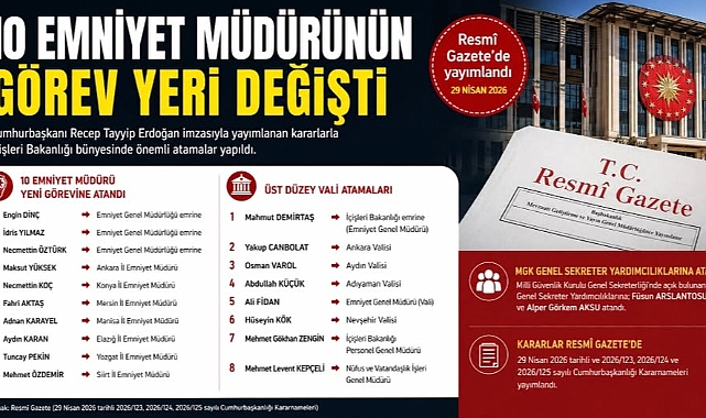 Cumhurbaşkanı Recep Tayyip Erdoğan'ın imzasını taşıyan atama kararları Resmi Gazete'de yayımlandı.Resmi Gazete’de yayımlanan atama kararına göre Emniyet Genel Müdürü Mahmut Demirtaş görevden alındı, yerine Nevşehir Valisi Ali Fidan atandı.Ankara Valisi Vasip Şahin, Türkiye İnsan Hakları ve Eşitlik Kurulu Başkanlığına atandı. Şahin'in yerine Ankara Valisi olarak Aydın Valisi Yakup Canbolat atandı. Adıyaman Valisi Osman Varol ise Aydın Valisi oldu. İstanbul-Güngören Kaymakamı Abdullah Küçük de yaman Valisi olarak atandı.Nevşehir Valisi Ali Fidan, Emniyet Genel Müdürü (Vali) olarak atanırken; Göç İdaresi Başkanı Hüseyin Kök Nevşehir Valiliğine atandı. İçişleri Bakanlığında da atamalar yapıldı. Personel Genel Müdür Yardımcısı Mehmet Gökhan Zengin ile Nüfus ve Vatandaşlık İşleri Genel Müdür Yardımcısı Mehmet Levent Kepçeli, Genel Müdür oldu.Emniyet Genel Müdürlüğünde de atamalar oldu. Ankara İl Emniyet Müdürü Engin Dinç, Mersin İl Emniyet Müdürü İdris Yılmaz ve Siirt İl Emniyet Müdürü Necmettin Öztürk, Emniyet Genel Müdürlüğü emrine atandı. Konya İl Emniyet Müdürü Maksut Yüksek Ankara İl Emniyet Müdürü; Yozgat İl Emniyet Müdürü Necmettin Koç Konya İl Emniyet Müdürü; Manisa İl Emniyet Müdürü Fahri Aktaş Mersin İl Emniyet Müdürü; Elazığ İl Emniyet Müdürü Adnan Karayel Manisa İl Emniyet Müdürü; Polis Başmüfettişi Aydın Karan Elazığ İl Emniyet Müdürü, Polis Başmüfettişi Tuncay Pekin Yozgat İl Emniyet Müdürü olarak atandı.