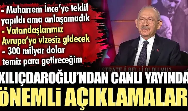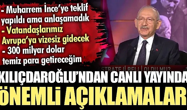 "KURBAN BAYRAMINDA 15 BİN LİRA EMEKLİLERE YATACAK"Ne söylüyorsam hepsinde haklıyım. Cesaret edip oturup konuşmuyorlar. 27,5 yılını devlette harcayan, verilmeyecek hiçbir hesabı olmayacak kişiyim. Bütün sülalemizi araştırdılar, ne buldular?Her şeyi kuruşu kuruşuna hesaplıyoruz ve yapıyoruz. Erdoğan ne diyor? 'Emekli maaşı üzerinden istismar ediyormuş'. Biz iki maaş ikramiye dedik, sonra ne oldu? Emekliye verdi iki maaş ikramiyeyi. Ben emekliye asgari ücret kadar Ramazan ve Kurban'da verilecek. Aynı şeyi söylüyorum. Hesabını kitabını kuruşu kuruşuna yaptık. Kurban bayramında Cumhurbaşkanı olarak geldiğimde bütün emeklilerin hesabı 15 bin lira para yatacak. Önümüzdeki kurban bayramında. Bütün emekliler görecek. Para yokmuş, 5'li çeteye paralar var, KKM'ye para var, saraydan maaş alanlara par var.Emekli bu ülkenin kalkınması için emek harcayan kişidir. Bütün hayatında çalıştı, alın teri döktü, primini ödedi ve sonra geldi emekli oldu. Eskide emeklinin aldığı aylık asgari ücretten fazlaydı. Şimdi açlık sınırının altında. Emekliyi bu hale getirdiler. Ben o aylıkları tamamını Kurban Bayramı'nda her bir emeklinin aylığına yatıracağım. 15 bin lirayı yatıracağım. Görecekler Bay Kemal sözünden dönmez."5Lİ ÇETELER HERKESİ SATIN ALACAKLARINI DÜŞÜNÜYOR"5'li çeteler benim Cumhurbaşkanı adayı olmamı asla istemedi. 418 milyar doları götürenler, kul hakkı yiyenler, yolsuzluk yapanlar asla istemediler. Engel olmak istediler. Bunların para gücü var, imkanları var, herkesi satın alacaklarını düşünüyorlar. Allah şahittir ne onların paralarına ne 1 centine ne 1 kuruşuna asla ihtiyacım var. Sarayda değil Çankaya'da yaşayacağım. Sade hayat yaşayacağım. Hayalim, hiçbir çocuğun yatağa aç girmemesi. Akdeniz havzasının en güçlü olacak bir ülke. Bunu yaratacağız, hiç endişem yok. Zengin, güçlü, sözü dinlenen, teknolojiye imza atan Türkiye. Para var bizde.O 418 milyarın nerelere gittiğini çok iyi biliyorum. Yurt dışında hukukçularla görüştüm. Kimin parası hangi bankada? Kuruşu kuruşa biliyorum. Belediye başkanlığı yapanlar ve yapmış olanlar dahil. O paraların tamamını getireceğiz."KİMLERİ SATIN ALDIKLARINI GAYET İYİ BİLİYORUM"Kin tutmak şöyle; bu iş yapılırken intikam değil hukuk zihniyetiyle. Bütün bunları belgeleyeceğim, yargıya teslim edeceğim. Yargı bunlara bakacak yolsuzluk varsa bunları yurt dışından isteyecek. Biz kinle öfkeyle hareket edersek bunlardan farkımız kalmaz. Adalet aynı zamanda haksızlık karşısında susmamaktır.Ben onları çok iyi biliyorum. Nerelerde neler yaptığını gayet iyi biliyorum. Kimleri satın aldıklarını gayet iyi biliyorum. Yeri zamanı gelince onları açıklarız.Yazılar yazıldı, haberler yapıldı, haksız eleştiriler yapıldı. Kimlerin nasıl, nereden beslendiğini gayet iyi biliyorum. Bu devlet hepsini biliyor. Devletle bağımı koparmadım. Koskoca Türkiye Cumhuriyeti devletinin nasıl olur da bu hale düştüğünü devlette çalışanlar da biliyor."HER ŞEYİN BELGESİ VAR"Kılıçdaroğlu gidecek IMF'den para toplayacak? Ne toplayacak? Türkiye zengin ülke. Sen ABD'de gökdelenler yapacaksın, Muhammed Ali Clay'ın çiftliğine evler yapacaksın, Kemal Kılıçdaroğlu bunu seyredecek. Dünyanın hiçbir mahkemesi uluslararası mahkeme bir devletin soyulmasına izin vermez. Bu konudaki kararları da çıkardım.Hepsinin belgesi var. Devlete liyakatı öldürürseniz süreç başka yere evrilmiş olur. Devletin kolonları kesilir. Şimdi adalet var mı? Adalet kolonu devletin orta direğidir. Adaleti yeniden inşa etmemiz lazım. Medya özgür mü? Hayır değil. Biraz eleştirin RTÜK kapatır. İletişim Başkanlığı işi görevi bırakmış, trollerle Goebbels'in yaptığı işi yapıyor. Harcanan paraya üzülüyorum. Emekliye para vermiyorsun, milyonları, dolarları bu işlere harcıyorsun. İnsanda biraz vicdan olur."YAŞAYIŞIMI İNSANLARA AÇTIM, PROJELERİMİ ANLATTIM"Yaşayışını açtınız, geçmişinizi açtınız, samimiyetinizi açtınız. Devlet deneyimim var. Devlet adamı kimliğim var benim. Suriyeliler, Afganlarla ilgili projelerimi anlattım kamuoyuna. Öyle büyük laflar değil, hayali laflar değil, ayağı yere basan her şey.Sakin bir insanım, herkesi sağduyuyla dinlerim, her şeye itiraz etmem. Bürokraside bir terbiye öğretildi, birisi aksine bir şey söylüyorsa hemen yanıtlamayın, hafızanızda ölçün biçin ondan sonra cevap verin.Mantıklı bir eleştiri geliyorsa ona elbette bakıyorum. Bir yerde hata yapmışsak 'Evet hata yaptık' diyoruz. Hata insana özgü kavramdır. Hatasız kul olmaz diye şarkı bile var. Orhan Gencebay'ındı yanlış hatırlamıyorsam.Seccade olayı o kadar çok anlatıldı ki. İsmail Müftüoğlu Bey, eski Adalet Bakanı, bir platformun yöneticisi. Bir iftar yemeği verdi. Orada akaddemisyen insanlar vardı. Güzel bir iftar yaptık, dualar okundu. Arkasından konuşmalar yapıldı. Lokantanın iç bölümüne geçildi. Orada fotoğraflar çekildi. Yerde seccade olduğunu fark etmedim. İsmail Bey de fark etmedi. Kendisi Milli Selamet Partili eski Adalet Bakanı. Bir yanlışımız vardı orada, fark edemedik. Biz politikacılar yere çok az bakarız. Hep karşıya bakarız. Koruma uyarır 'Efendim kaldırım var, çukur var' diye. Gelen kişilerle fotoğraf çektirdik. Eleştiri gelebilir. Kalkıp da bir suçlama yapmak istemem. Ben samimi bir Müslümanım.Onu bilmiyorum ama gerçeklerden yola çıkarım. Tuzak, komplo diyenler oldu. O gerçeği bir gerekçeye sığdırmam bana yakışmaz. Ben samimi Müslümanım. Herkesin inancına, kimliğine saygı duyarım. Benim kalkıp da onu gerekçelendirip başka bir şeylerle örtmeye çalışmam olmazdı. Evet bunu samimi Müslümanlara sığınıyorum. Bir eksiğimiz, yanlışımız vardı evet doğru."PEYGAMBERE VER